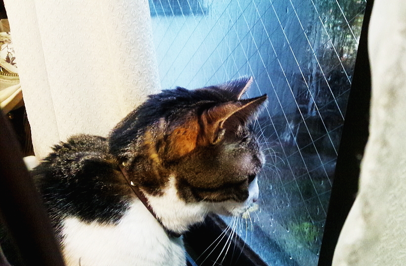 いつもの定位置で残念そうに外を眺めます。
