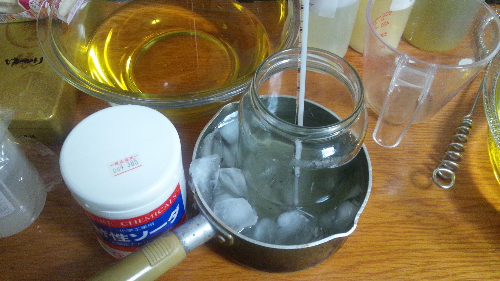 好みのオイルをMixして40℃に保ち、苛性ソーダを精製水で溶かしたものも40℃にし、ゆっくり混ぜて、ブレンダーで攪拌すると 上の写真のようなミルキーな状態になって、もったりしてきます。