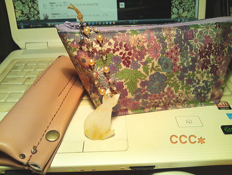 スワロフスキーのシルクというカラーと、にゃんこのモチーフで、しおりをつくっていました。本用のしおりですが、手作りのペンケースとカラーが馴染んでいたのでこちらにつけてみたら春らしい装い。